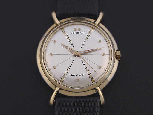 The Hamilton “Automatic K-454” is often referred to as the “Sputnik” for its futuristic Space Age design and was priced to consumers at $89.50 in 1955. This model was chosen for the character Pete Campbell to wear on the television series “Mad Men.” The actual watch worn in the series just sold for over $4,000. This example is in excellent condition with no brassing. Screwdown caseback is excellent and unengraved. The case measures and 41mm long and 34mm wide. Refinished dial is superb. Has luminous dots and gold inlaid rays that match the lugs. Has new acrylic crystal. Movement is a 17-jewel Hamilton grade 661 automatic.